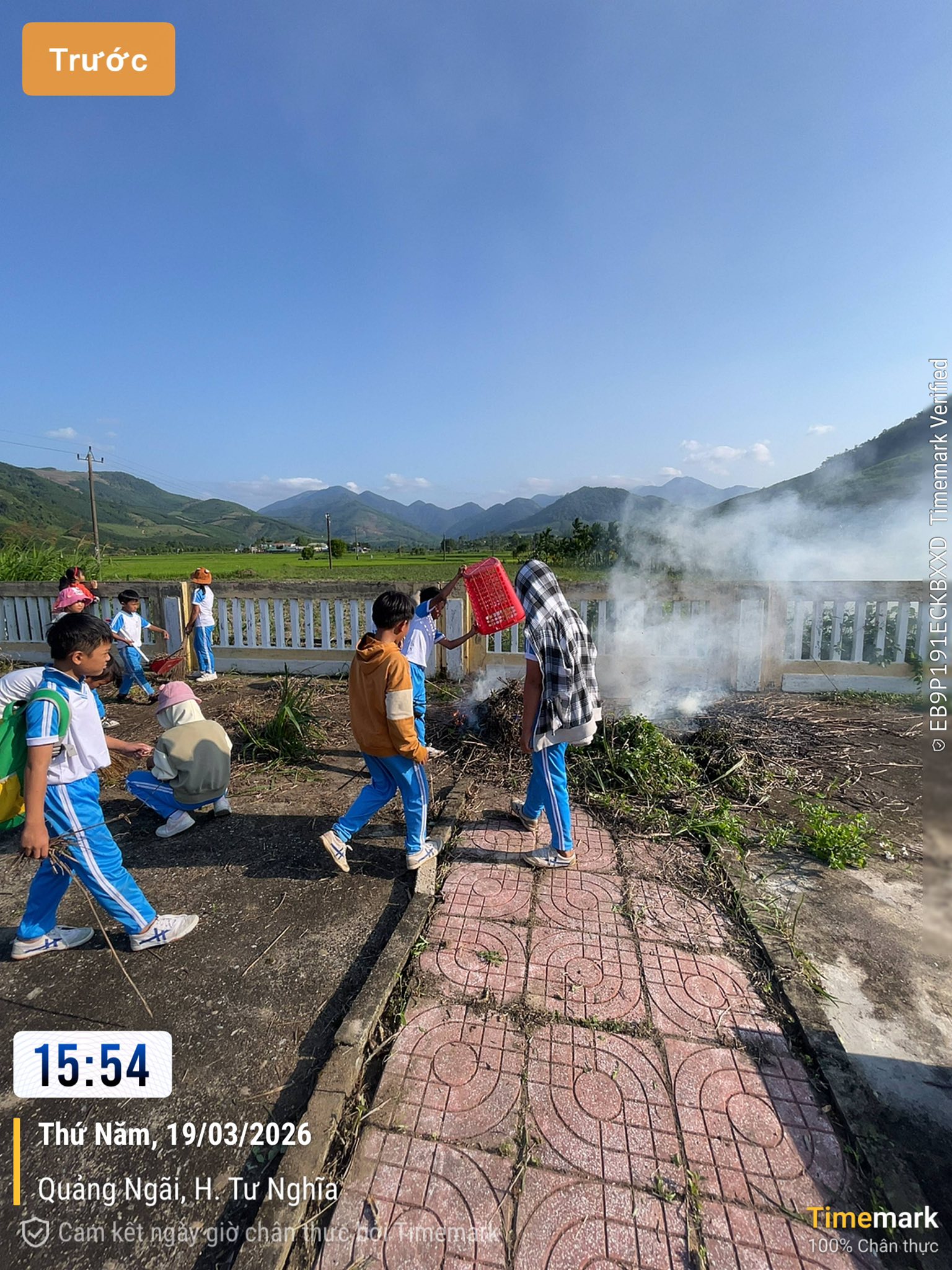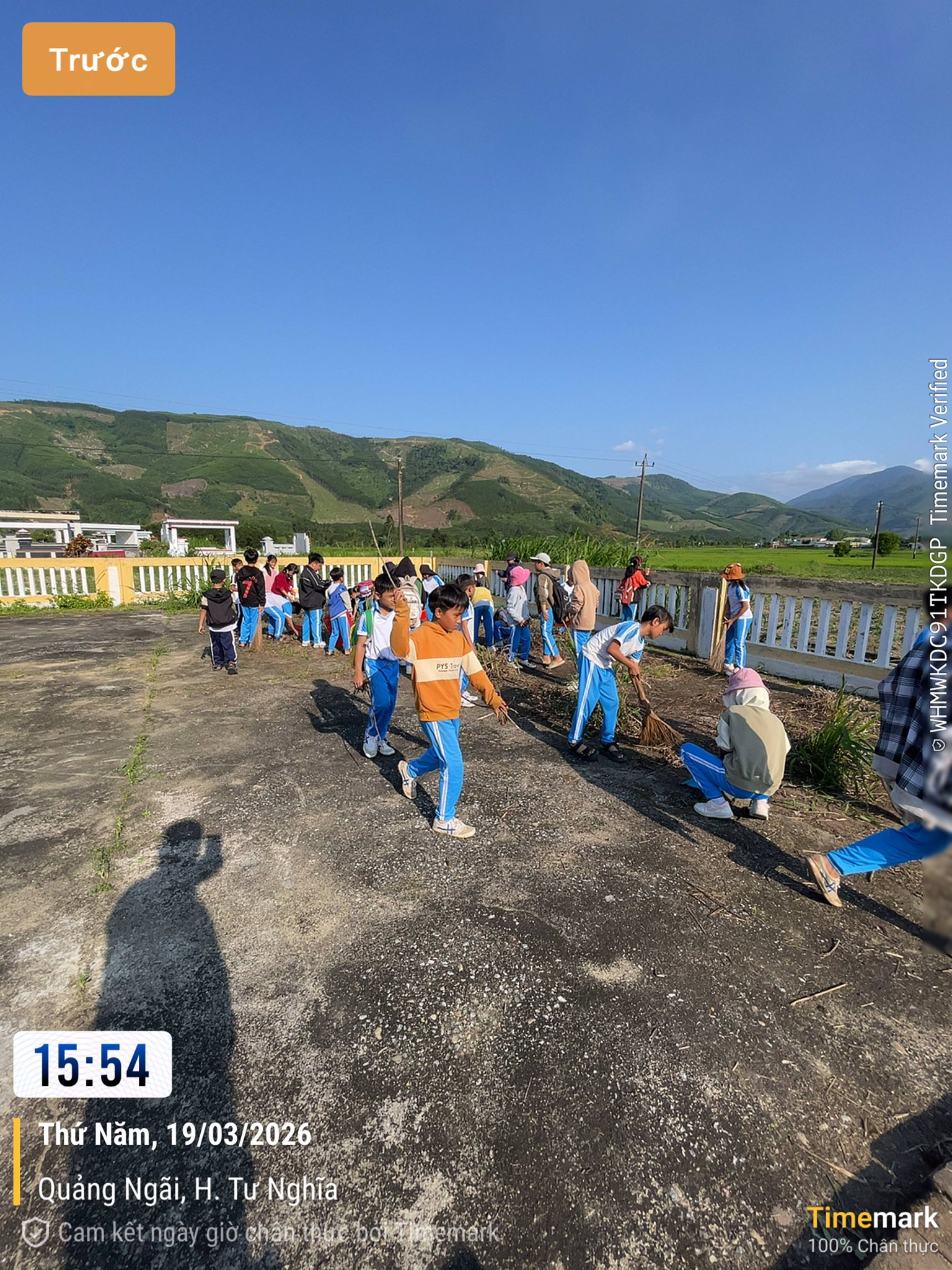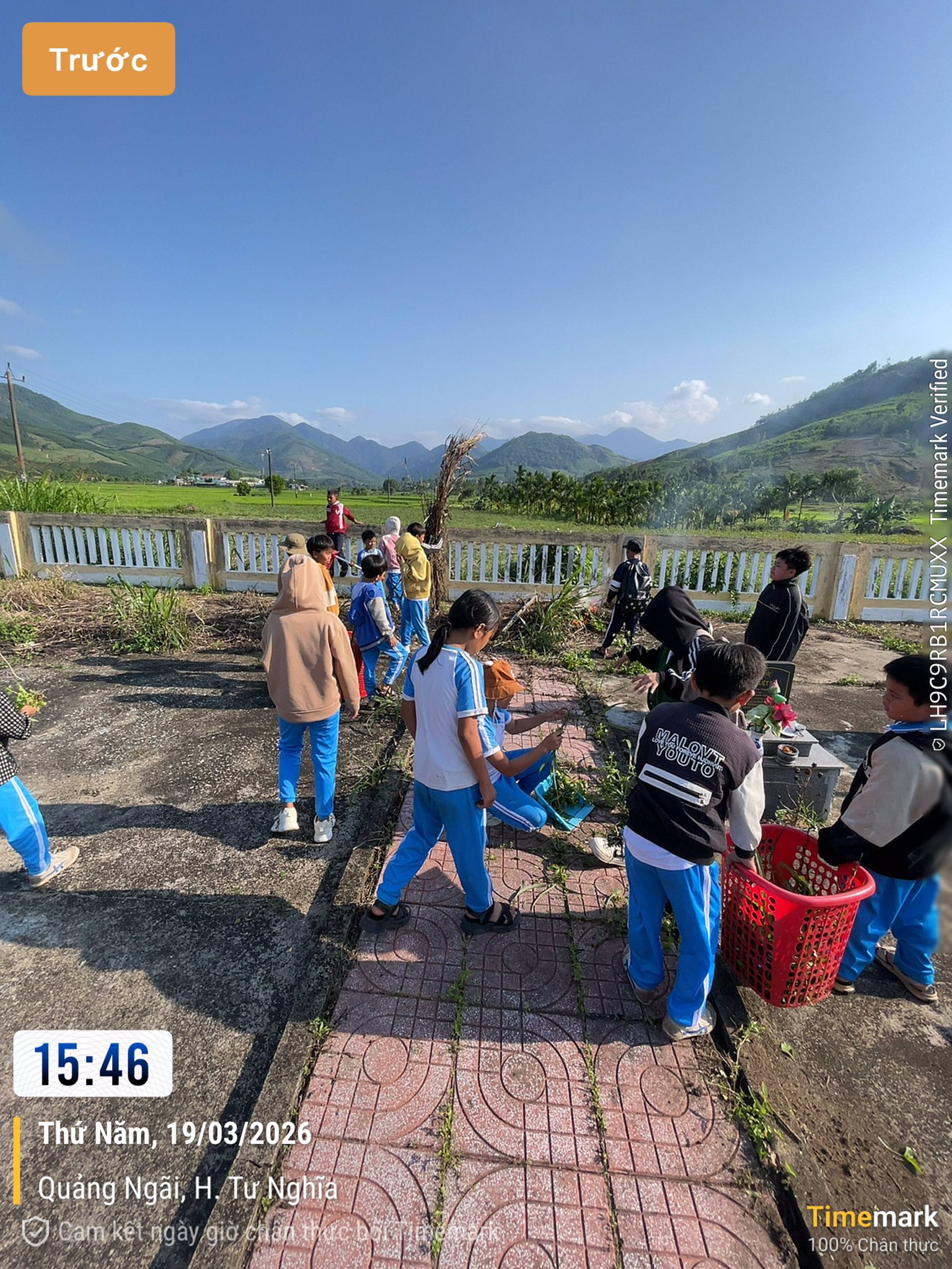 Các em học sinh khối 4-5 cùng nhau dọn vệ sinh khuôn viên nghĩa trang liệt sĩ Nghĩa Sơn